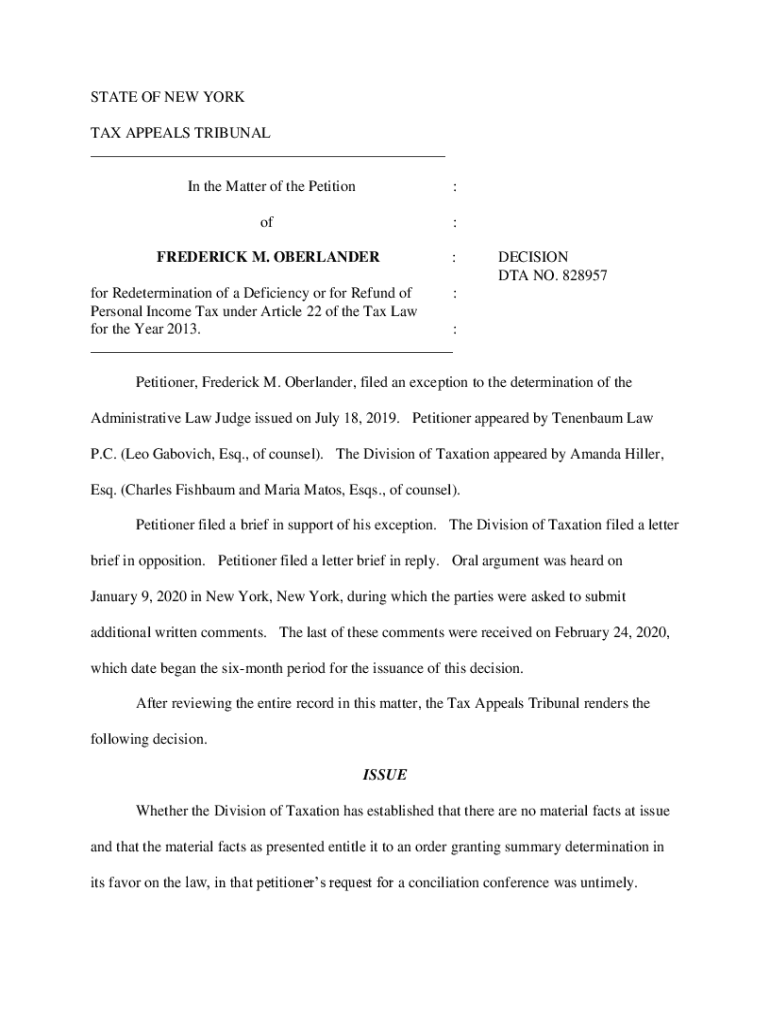 STATE OF NEW YORK TAX APPEALS TRIBUNAL ___ In the Matter of the Petition:of:FREDERICK M. OVERLAND:DECISION DTA NO. 828957for Redetermination of a Deficiency or for Refund of : Personal Income Tax