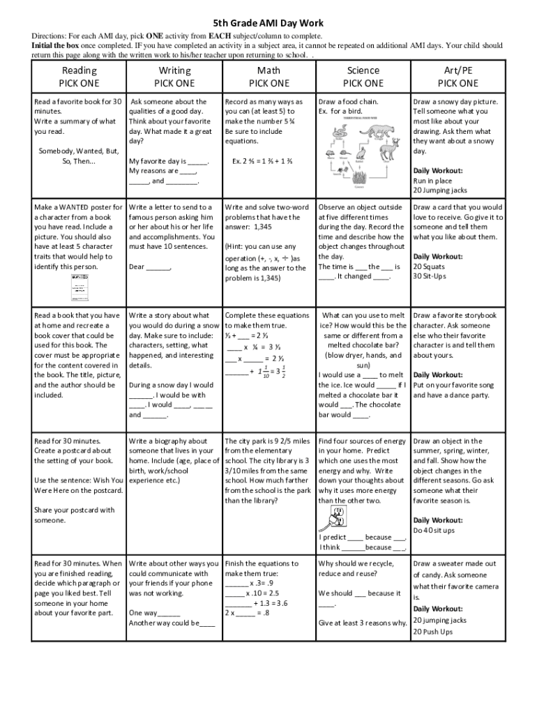5th Grade AMI Day Work Directions: For each AMI day, pick ONE activity from EACH subject/column to complete. Initial the box once completed. IF you have completed an activity in a subject area, it