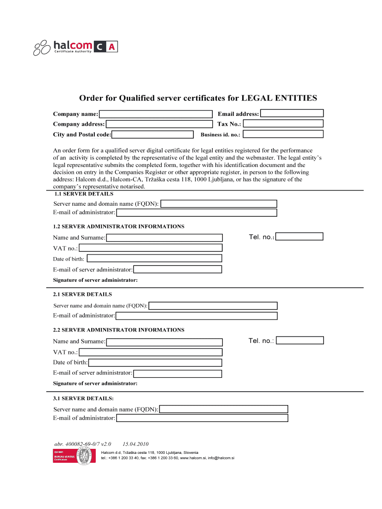 Get the free Order for Qualified server certificates for LEGAL ... - Halcom CA