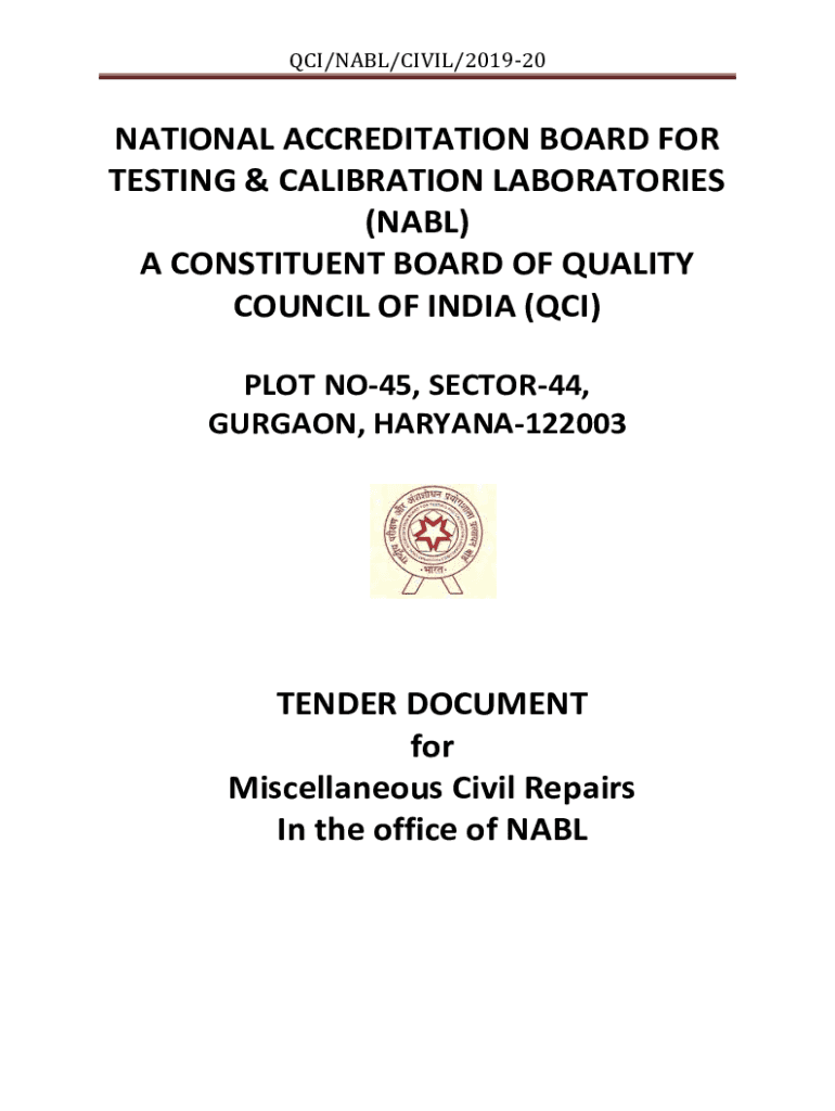 PCI/NAIL/CIVIL/201920NATIONAL ACCREDITATION BOARD FOR TESTING & CALIBRATION LABORATORIES (NAIL) A CONSTITUENT BOARD OF QUALITY COUNCIL OF INDIA (PCI) PLOT NO45, SECTOR44, GURGAON, HARYANA122003TENDER