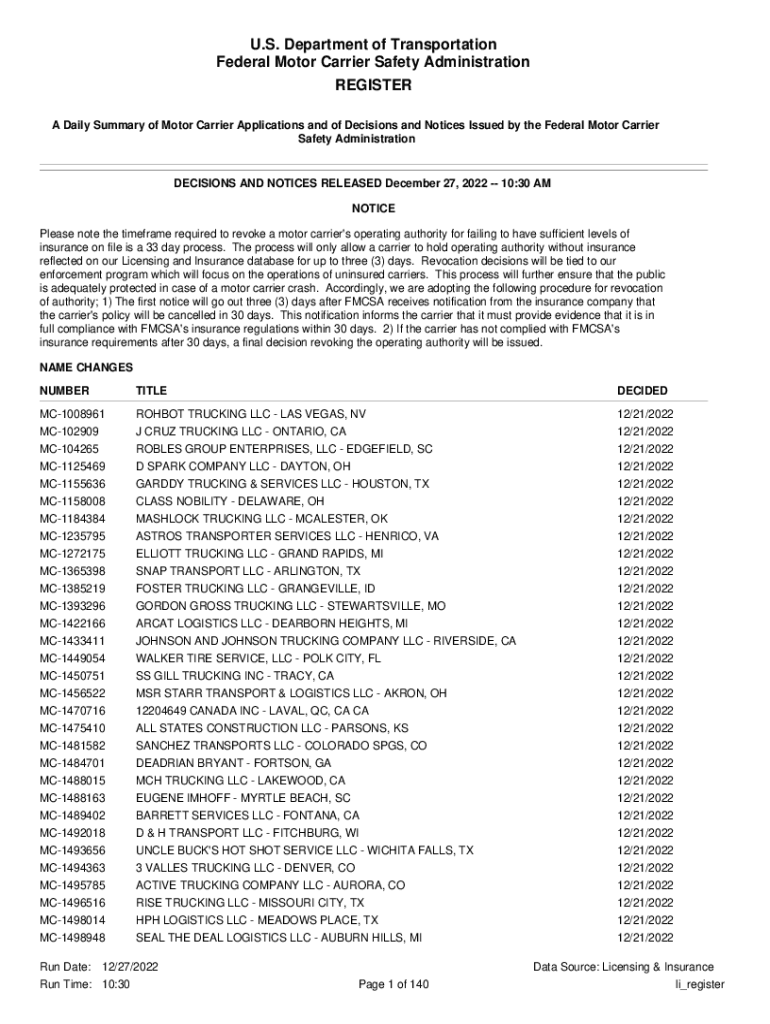 A Daily Summary of Motor Carrier Applications and of Decisions and Notices Issued by the Federal Motor Carrier