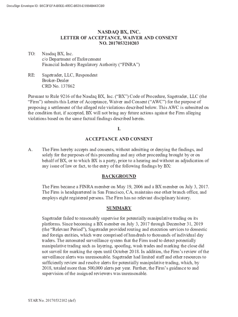 NASDAQ BX, INC. LETTER OF ACCEPTANCE, WAIVER AND CONSENT NO. 2017053210203 TO:Nasdaq BX, Inc. c/o Department of Enforcement Financial Industry Regulatory Authority (FINRA’RE:Sage trader, LLC, Respondent