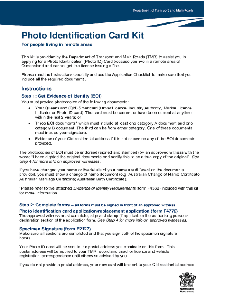 Photo Identification Card Kit For people living in remote areas This kit is provided by the Department of Transport and Main Roads (MR) to assist you in applying for a Photo Identification (Photo