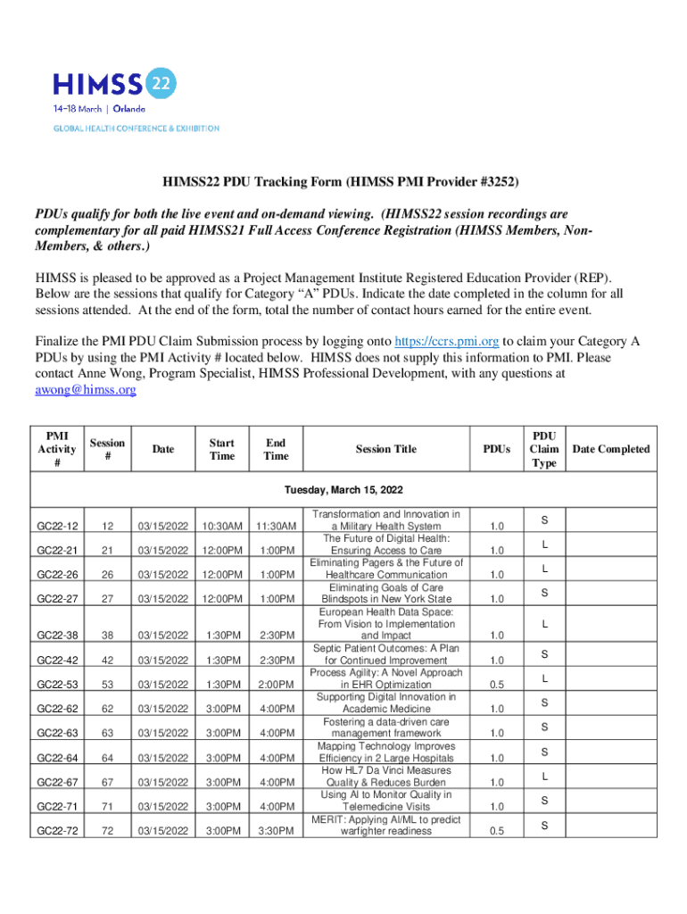 HIMSS22 PDU Tracking Form (HISS PMI Provider #3252) Plus qualify for both the live event and on demand viewing. (HIMSS22 session recordings are complementary for all paid HIMSS21 Full Access Conference
