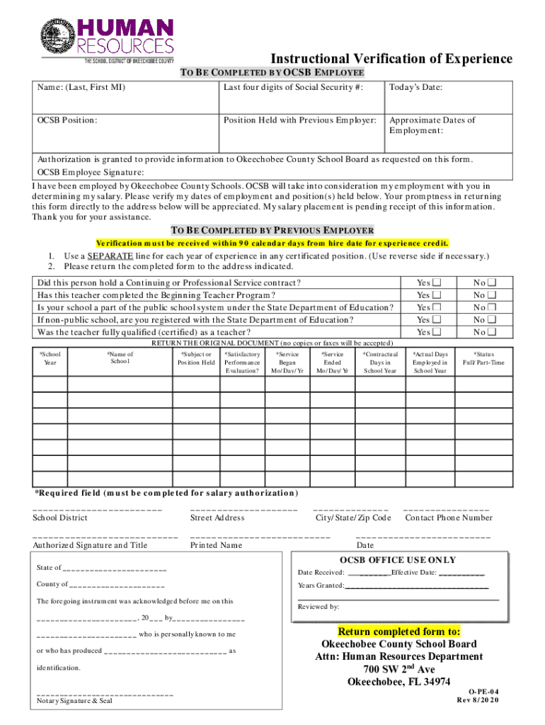 Instructional Verification of Experience TO BE COMPLETED BY OCS EMPLOYEE Name: (Last, First MI)Last four digits of Social Security #:Today's Date:OCS Position:Position Held with Previous Employer:Approximate