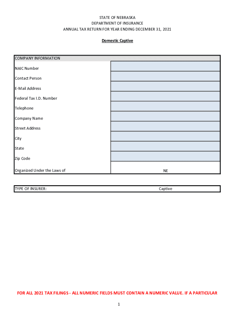 STATE OF NEBRASKA DEPARTMENT OF INSURANCE ANNUAL TAX RETURN FOR YEAR ENDING DECEMBER 31, 2021, Domestic CaptiveCOMPANY INFORMATION NAIL Number Contact Person Email Address Federal Tax I.D. Number