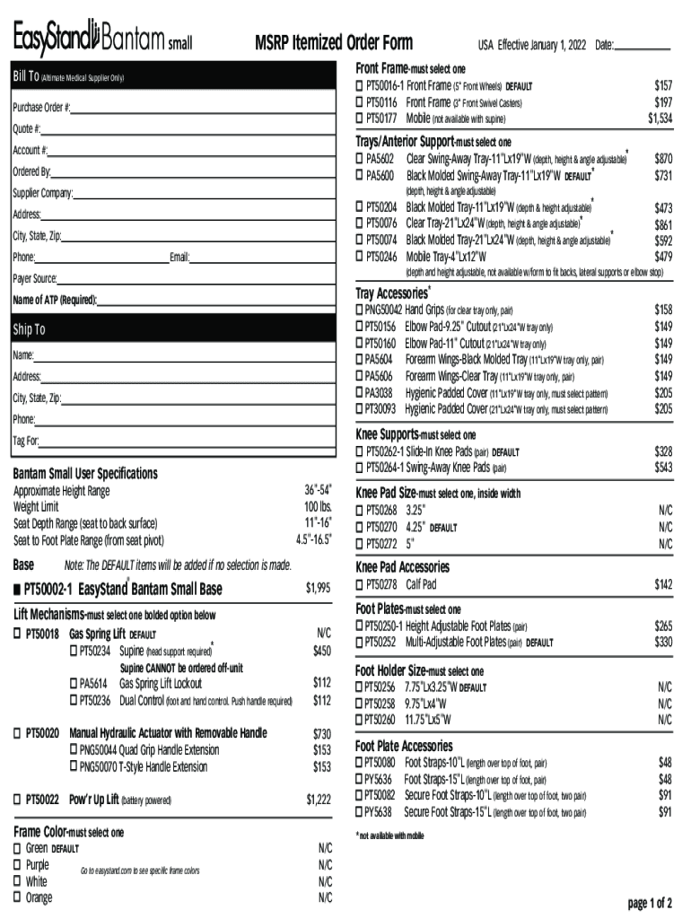 MSRP Itemized Order FormPT500161 Front Frame (5\” Front Wheels) DEFAULT PT50116 Front Frame (3\” Front Swivel Casters) PT50177 Mobile (not available with supine)Purchase Order #: Quote #:Trays/Anterior
