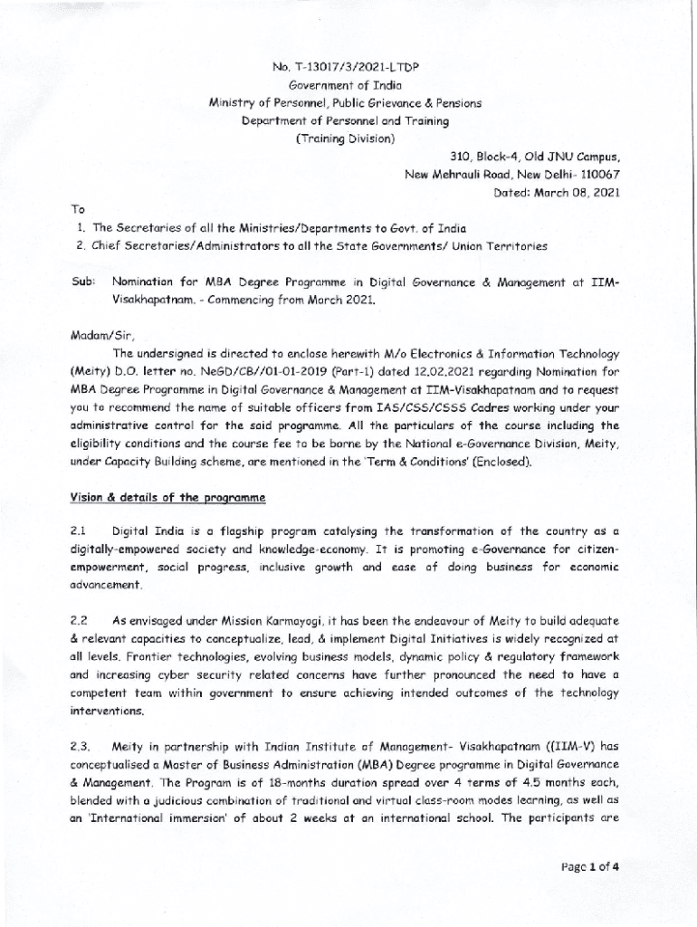 No. T13017/3/2021LTDP Government of India Ministry of Personnel, Public Grievance & Pensions Department of Personnel and Training (Training Division) 310, Block4, Old NU Campus, New Hérault load,