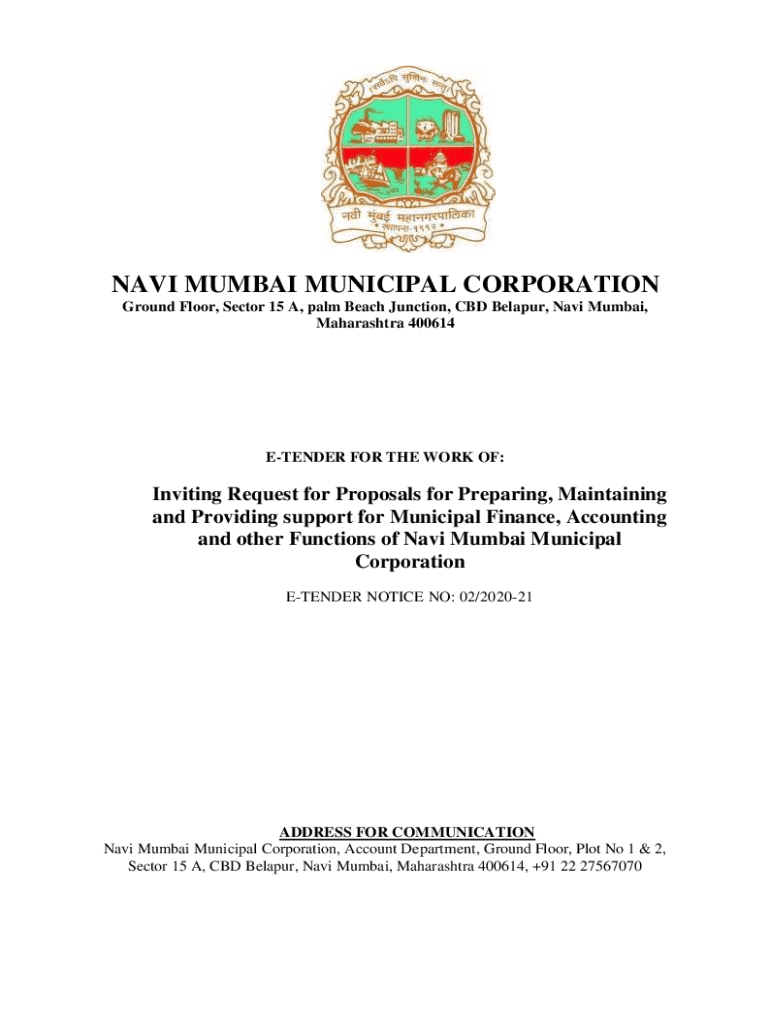 NAVI MUMBAI MUNICIPAL CORPORATION First Floor, Sector 15 A, Palm Beach Junction, CBD Belarus, Navi Mumbai, Maharashtra 400614ETENDER FOR THE WORK OF:Inviting Request for Proposals for Preparing, Maintaining
