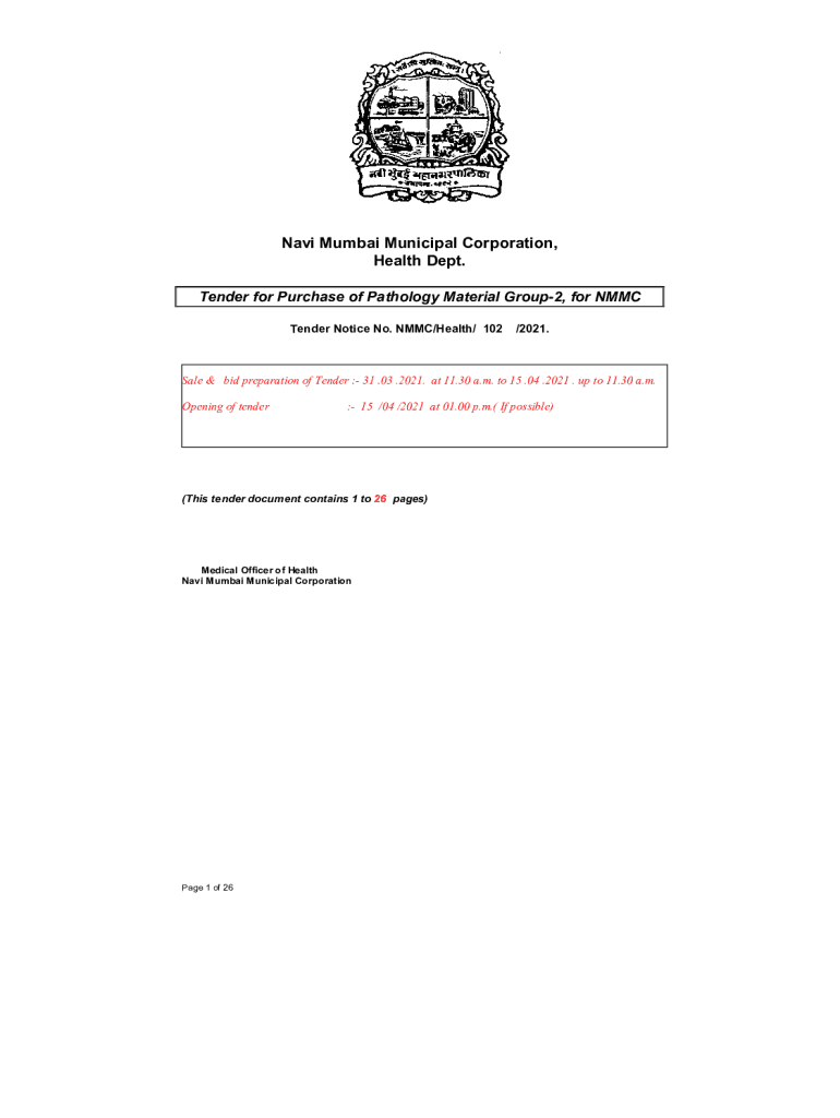 Navi Mumbai Municipal Corporation, Health Dept. Tender for Purchase of Pathology Material Group2, for MMC Tender Notice No. MMC/Health/ 102/2021. Sale & bid preparation of Tender : 31 .03 .2021. At