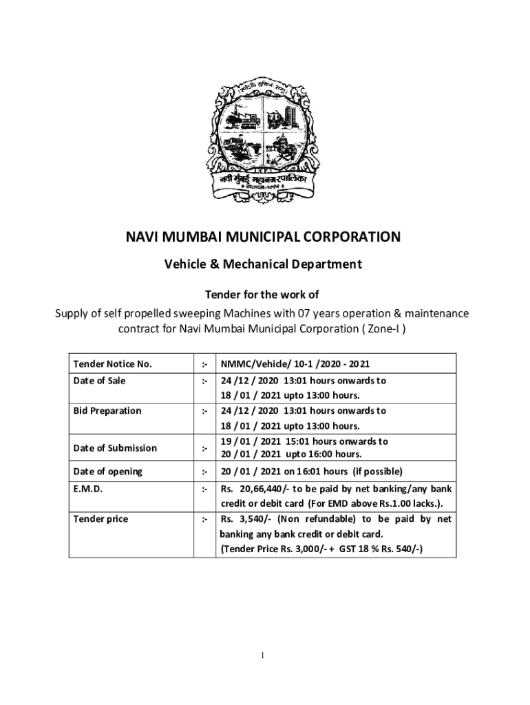 NAVI MUMBAI MUNICIPAL CORPORATION Vehicle & Mechanical Department Tender for the work of Supply of self-propelled sweeping Machines with 07 years operation & maintenance contract for Navi Mumbai Municipal