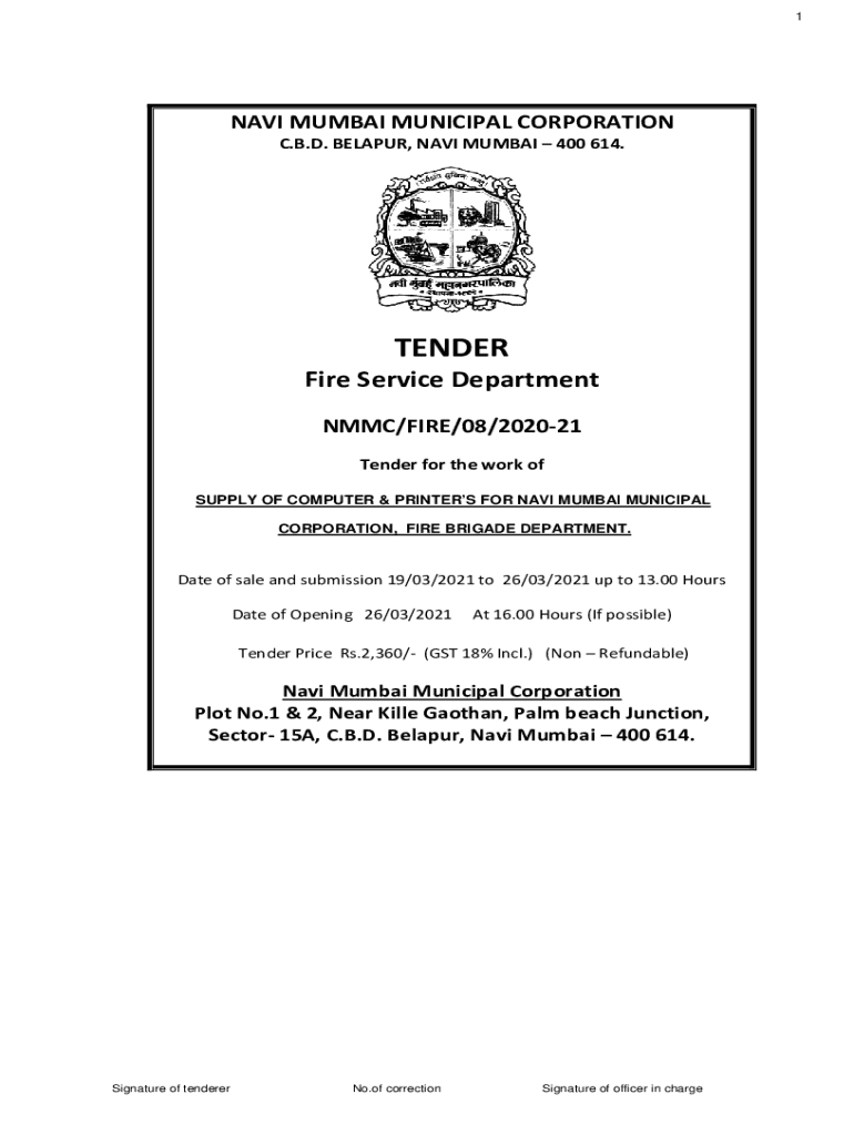 1NAVI MUMBAI MUNICIPAL CORPORATION C.B.D. BELARUS, NAVI MUMBAI 400 614.TENDER Fire Service Department MMC/FIRE/08/202021 Tender for the work of SUPPLY OF COMPUTER & PRINTERS FOR NAVI MUMBAI MUNICIPAL