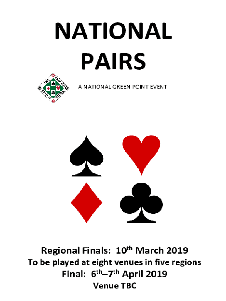 NATIONAL PAIRS A NATIONAL GREEN POINT EVENTRegional Finals: 10th March 2019 To be played at eight venues in five regionsFinal: 6th7th April 2019 Venue Binational Pairs Regional Finals 2018 Holders: