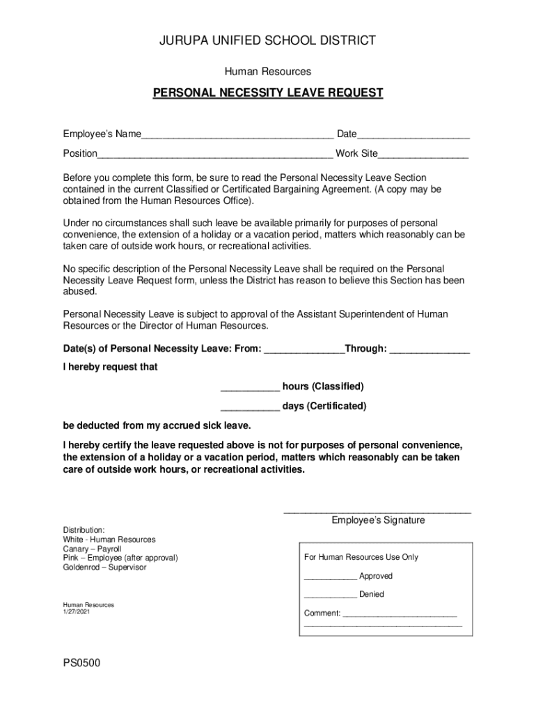 JURUPA UNIFIED SCHOOL DISTRICT Human ResourcesPERSONAL NECESSITY LEAVE REQUESTEmployees Name___ Date___ Position___ Work Site___ Before you complete this form, be sure to read the Personal Necessity