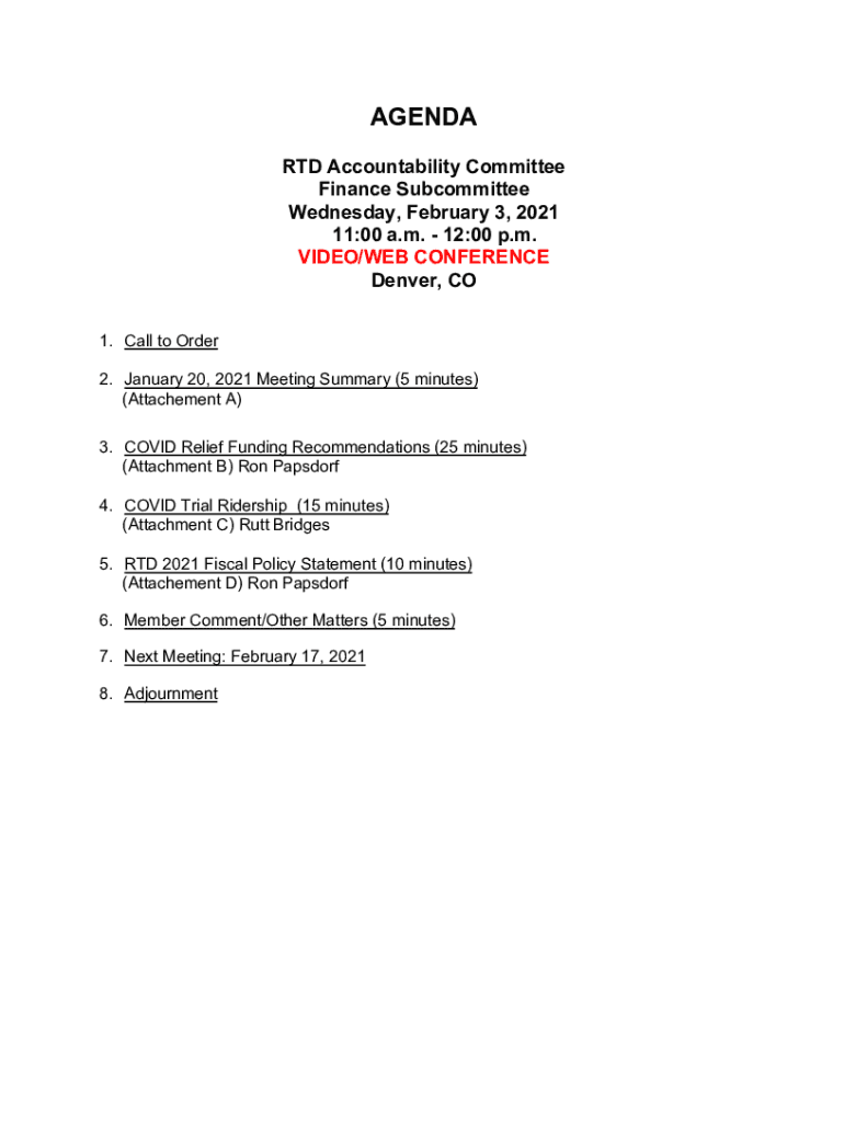 AGENDA RTD Accountability Committee Finance Subcommittee Wednesday, February 3, 2021 11:00 a.m. 12:00 p.m. VIDEO/WEB CONFERENCE Denver, CO 1. Call to Order 2. January 20, 2021, Meeting Summary (5