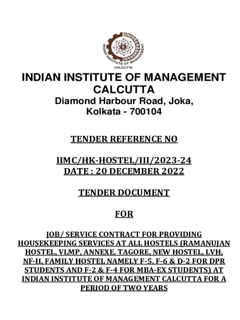 INDIAN INSTITUTE OF MANAGEMENT CALCUTTA Diamond Harbor Road, Jokey, Kolkata 700104 TENDER REFERENCE NO IMC/HOSTEL/III/202324 DATE : 20 DECEMBER 2022 TENDER DOCUMENT FOR JOB/ SERVICE CONTRACT FOR PROVIDING