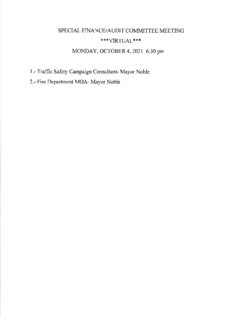 SPECIAL FINANCE/AUDIT COMMITTEE MEETING :l:&*VIRTUAL×,1. *MONDAY, OCTOBER 4,2021 6:30 pm1. Traffic Safety Campaign Consultant Mayor Noble2. Fire Department MOA Mayor NoblesRESOLUTION 114 of 2021