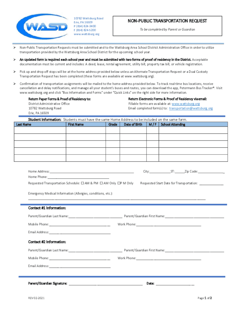 .10782 Watts burg Road Erie, PA 16509 P (814) 8243400 F (814) 8245200 www.wattsburg.orgNONPUBLIC TRANSPORTATION REQUEST To be completed by Parent or GuardianNonPublic Transportation Requests must