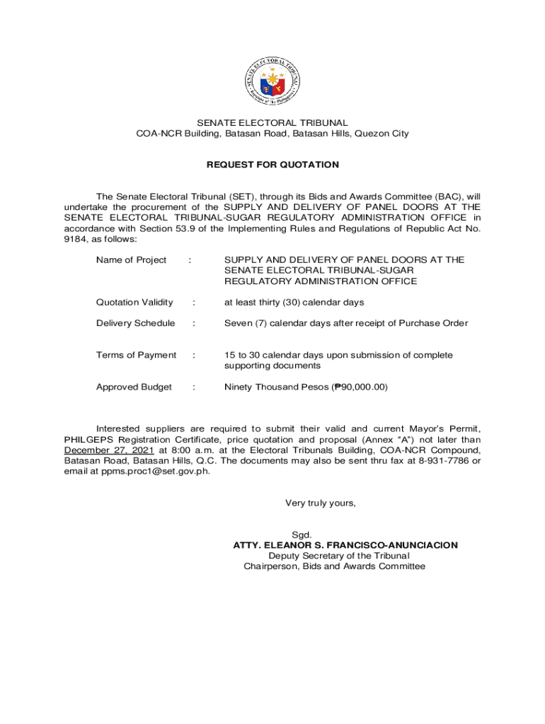 SENATE ELECTORAL TRIBUNAL COACH Building, Bataan Road, Bataan Hills, Quezon CityREQUEST FOR Quotation Senate Electoral Tribunal (SET), through its Bids and Awards Committee (BAC), will undertake the
