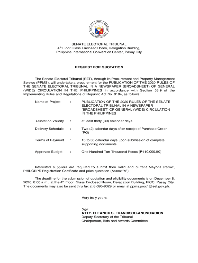 SENATE ELECTORAL TRIBUNAL 4th Floor Glass Enclosed Room, Delegation Building, Philippine International Convention Center, Pasty CityREQUEST FOR Quotation Senate Electoral Tribunal (SET), through its