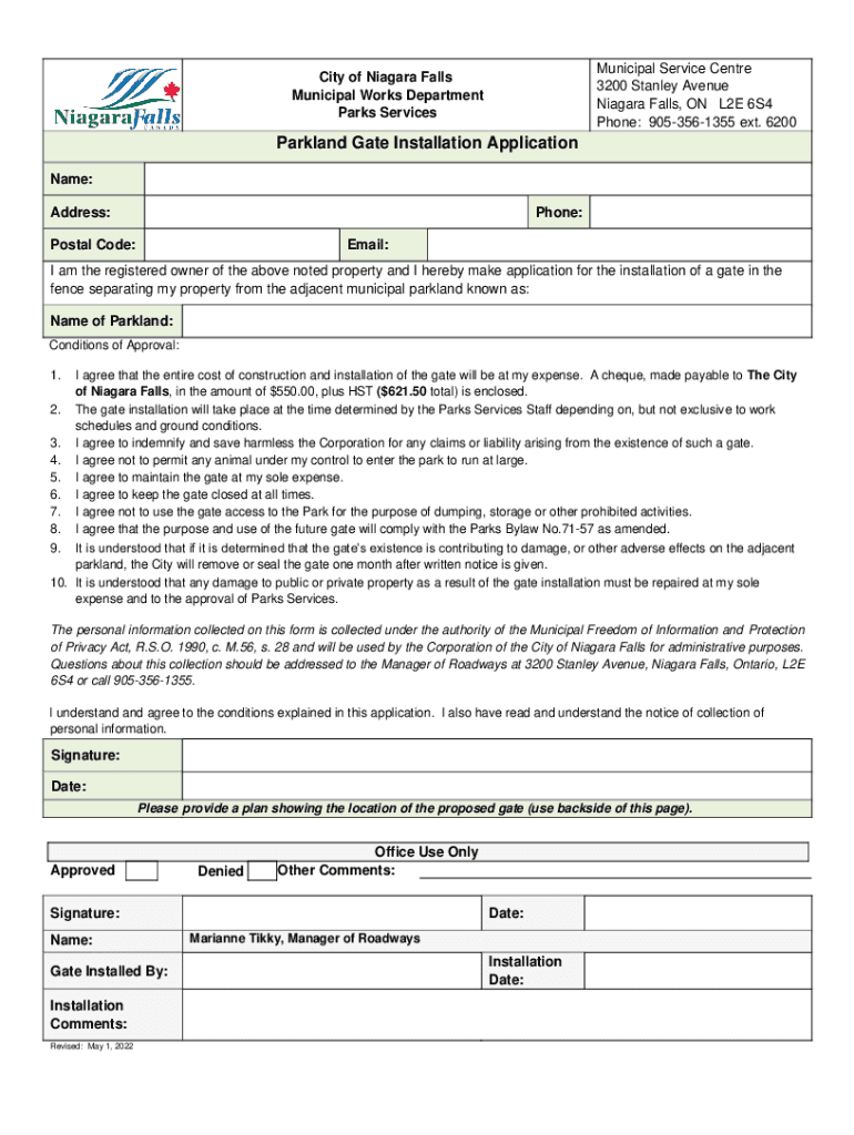 Municipal Service Center 3200 Stanley Avenue Niagara Falls, ON L2E 6S4 Phone: 9053561355 ext. 6200City of Niagara Falls Municipal Works Department Parks ServicesParkland Gate Installation Application