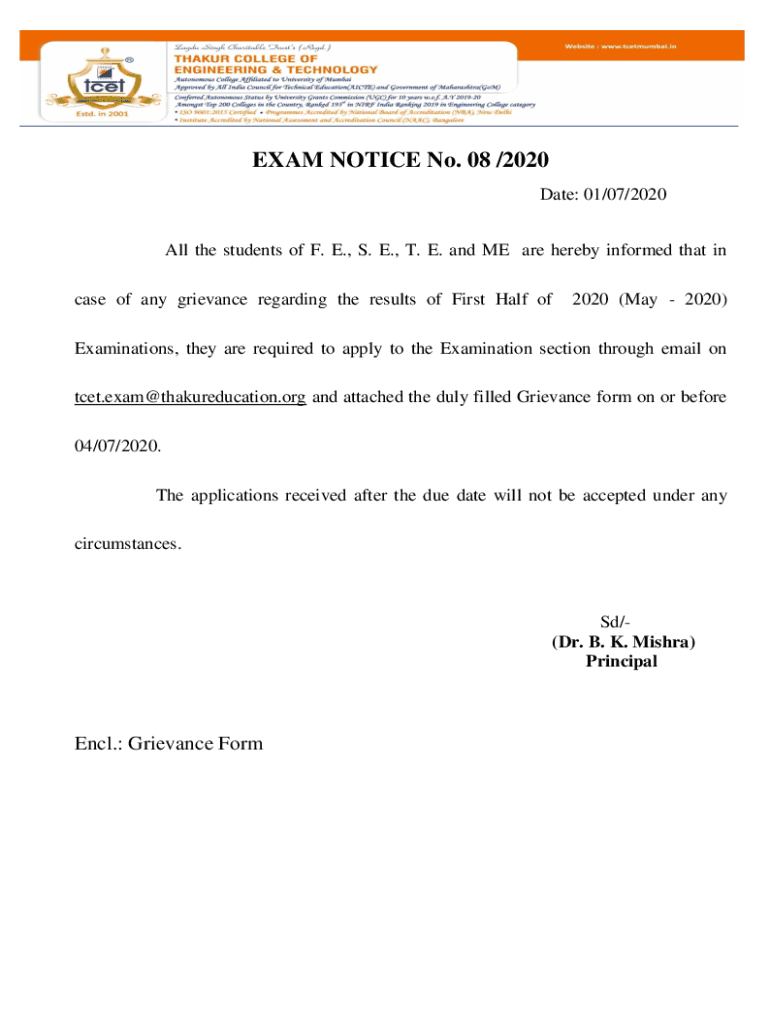 EXAM NOTICE No. 08 /2020 Date: 01/07/2020 All the students of F. E., S. E., T. E. and ME are hereby informed that in case of any grievance regarding the results of First Half of2020 (May 2020)Examinations,