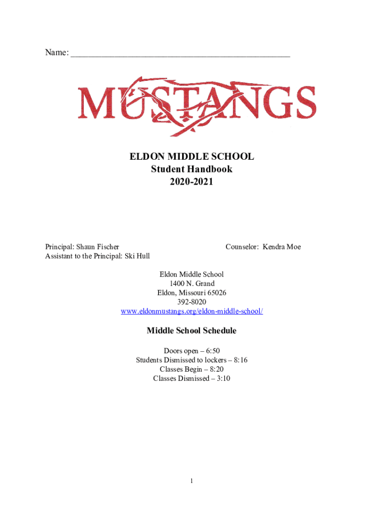 Name: ___ELDON MIDDLE SCHOOL Student Handbook 20202021Principal: Shaun Fischer Assistant to the Principal: Ski HullCounselor: Kendra Moe Eldon Middle School 1400 N. Grand Eldon, Missouri 65026 3928020