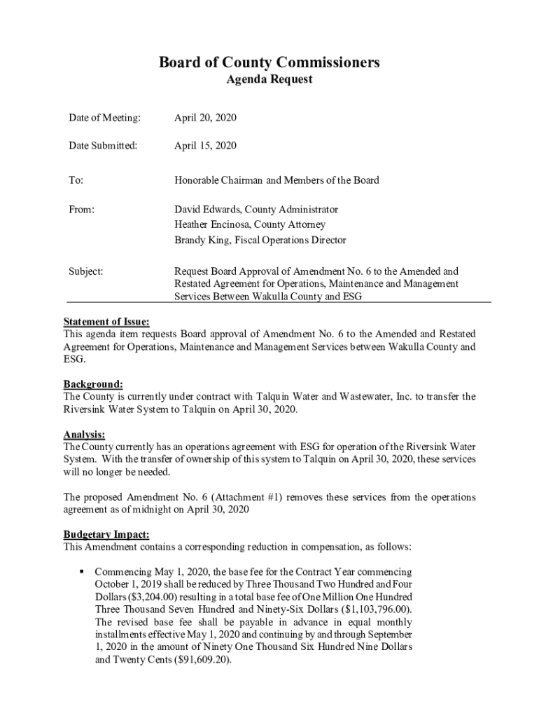 Agenda Sequestrate of Meeting:April 20, 2020Date Submitted:April 15, 2020To:Honorable Chairman and Members of the Boardroom:David Edwards, County Administrator