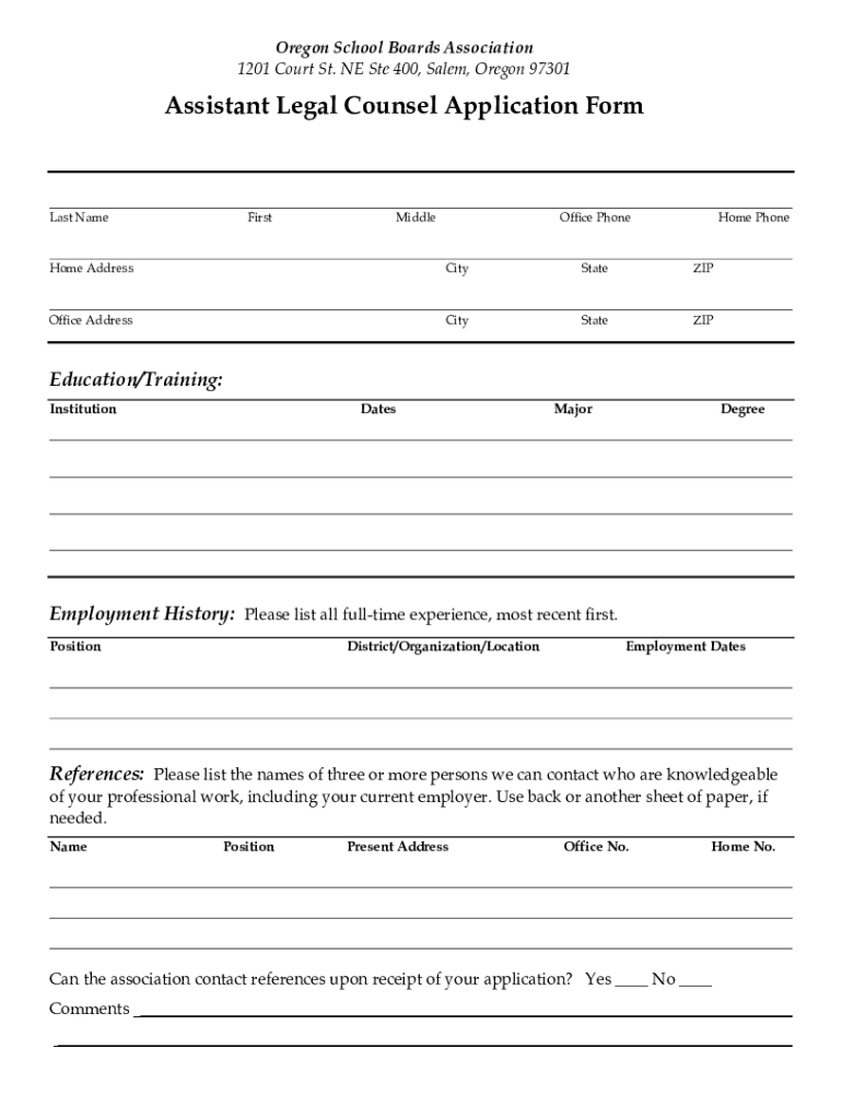 1201 Court St. NE Ste 400, Salem, Oregon 97301Assistant Legal Counsel Application Format NameFirstMiddleOffice Phoneme AddressCityStateZIPOffice AddressCityStateZIPEducation/Training: