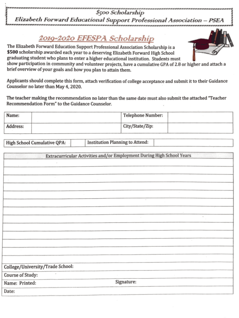 201192020EJFJEJPAt RC/h1olcJ1JrhttpThe Elizabeth Forward Education Support Professional Association Scholarship is a $500 scholarship awarded each year to a deserving Elizabeth Forward High School