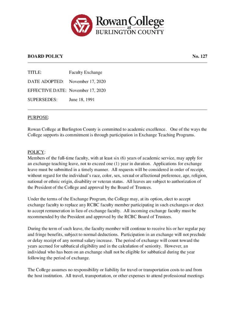 BOARD POLICY No. 127TITLE:Faculty Exchange DATE ADOPTED:November 17, 2020EFFECTIVE DATE: November 17, 2020, SUPERSEDES:June 18, 1991PURPOSE: Rowan College at Burlington County is committed to academic