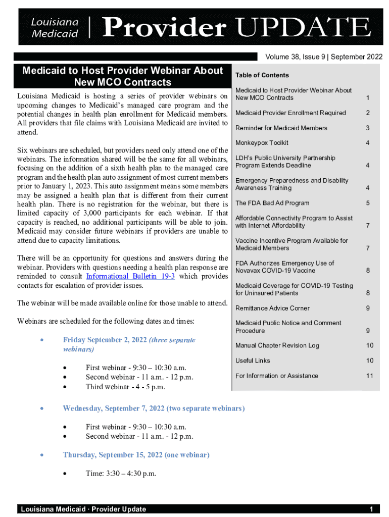 Volume 38, Issue 9 | September 2022Medicaid to Host Provider Webinar About New MCO Contractible of Contents Medicaid to Host Provider Webinar About Louisiana Medicaid is hosting a series of provider
