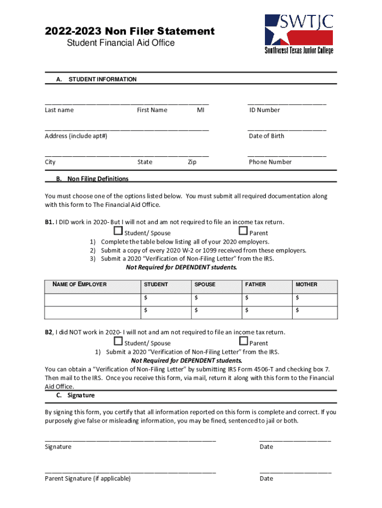 20222023 Non Filer Statement Student Financial Aid Offices. STUDENT INFORMATION___ Last name First Name MI___ ID Number___ Address (include apt#)___ Date of Birth___ City State Zip___ Phone Number.