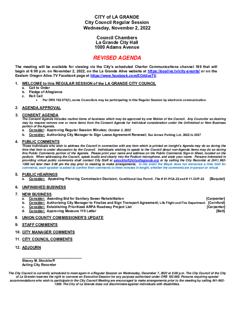 CITY of LA GRANDE City Council Regular Session Wednesday, November 2, 2022, Council Chambers La Grande City Hall 1000 Adams AvenueREVISED AGENDA The meeting will be available for viewing via the Cities