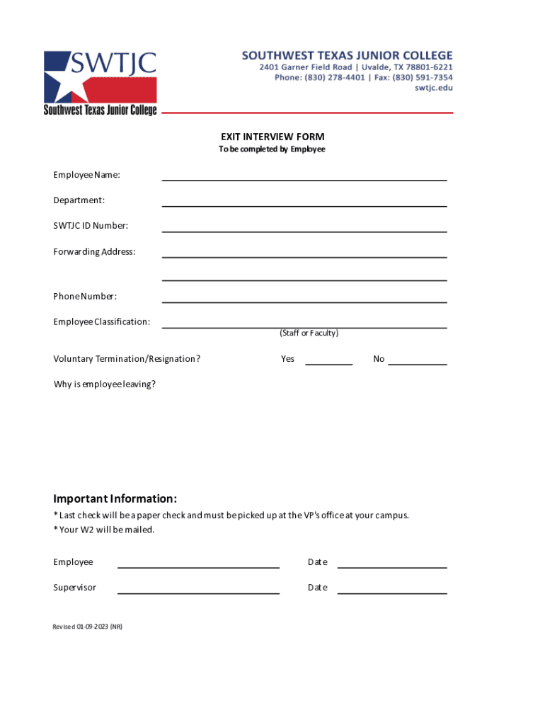 EXIT INTERVIEW FORM To be completed by EmployeeEmployee Name: Department: SW TJC ID Number: Forwarding Address:Phone Number: Employee Classification: Voluntary Termination/Resignation?(Staff or Faculty)Snowy