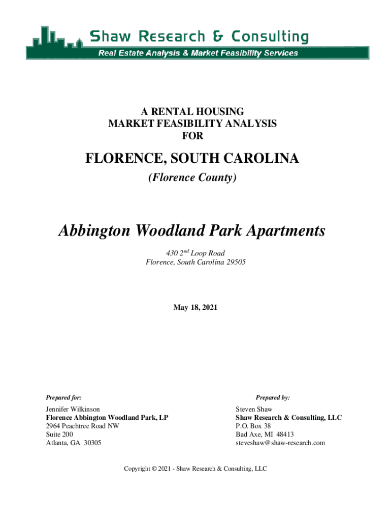 A RENTAL HOUSING MARKET FEASIBILITY ANALYSIS FLORENCE, SOUTH CAROLINA (Florence County)Abington Woodland Park Apartments 430 2nd Loop Road Florence, South Carolina 29505May 18, 2021Prepared for:Prepared