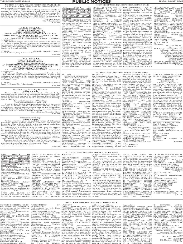 PUBLIC NOTICESTUESDAY, DECEMBER 13, 2022, NOTICE OF CITY BOARD POSITIONS AVAILABLEHealth Board, Library Board, Planning Commission & Economic Development Authority As of January 1, 2023, there will