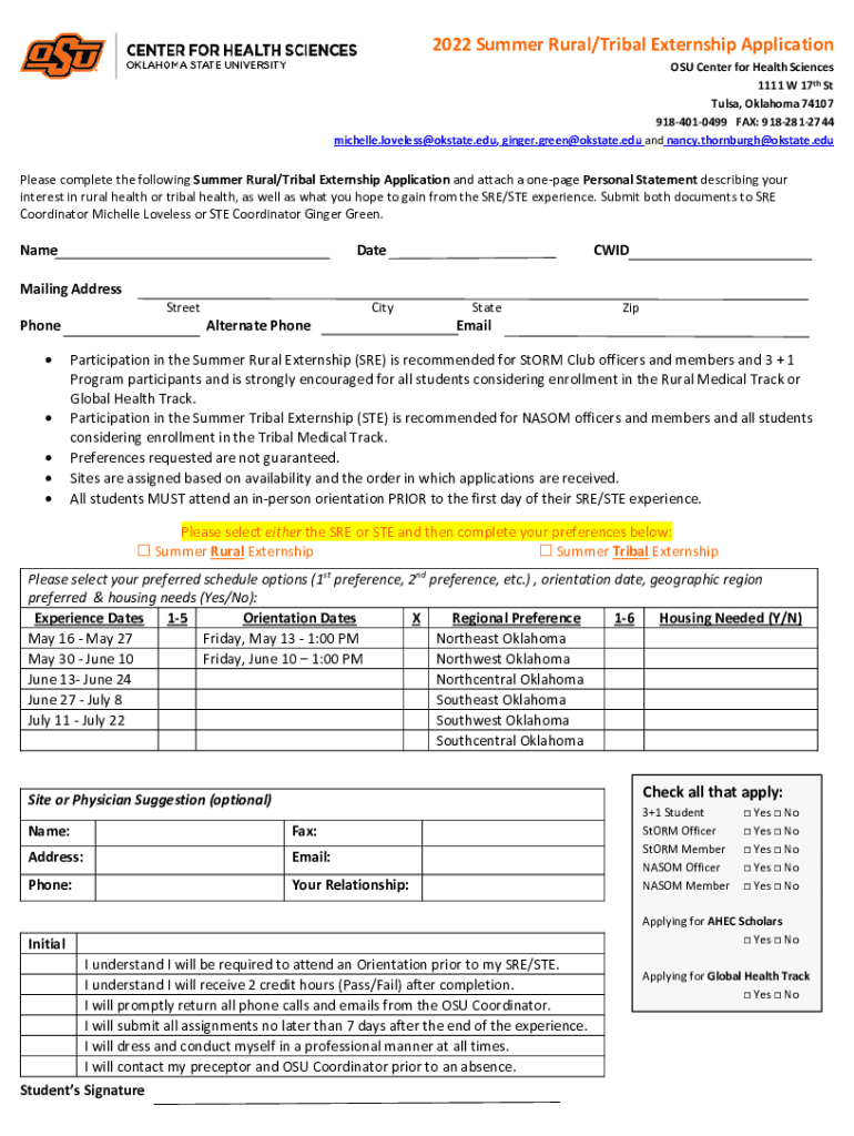 2022 Summer Rural/Tribal Externship Application OSU Center for Health Sciences 1111 W 17th St Tulsa, Oklahoma 74107 9184010499 FAX: 9182812744 michelle.loveless@okstate.edu, ginger.green@okstate.edu