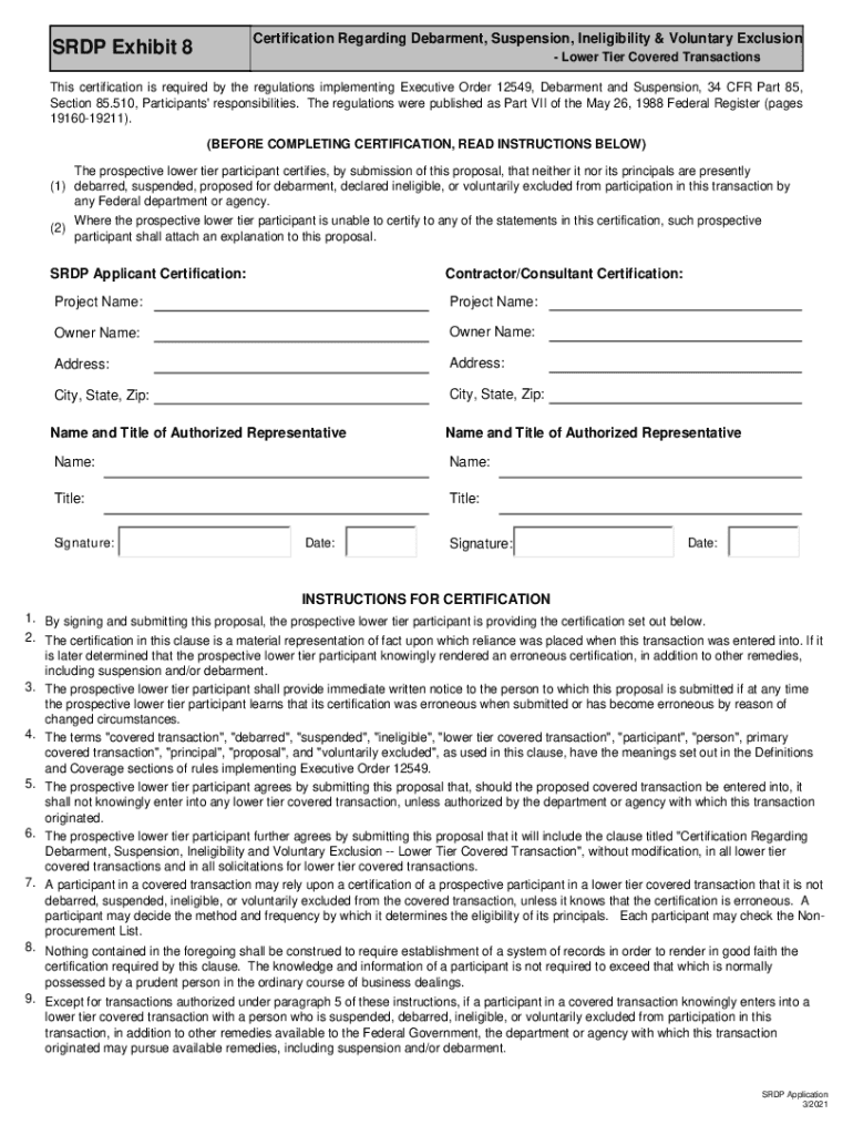 Certification Regarding Debarment, Suspension, Ineligibility & Voluntary Exclusions RDP Exhibit 8 Lower Tier Covered TransactionsThis certification is required by the regulations implementing Executive