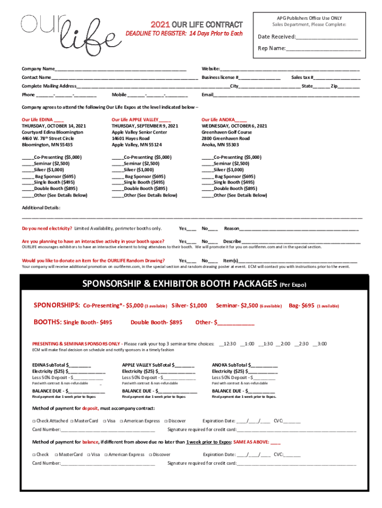APG Publishers Office Use ONLY Sales Department, Please Complete:2021 OUR LIFE CONTRACT DEADLINE TO REGISTER: 14 Days Prior to Each Eventuate Received:___ Rep Name:___Company Name___Website:___Contact