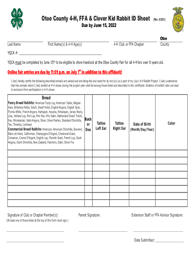 Otoe County 4H, FFA & Clover Kid Rabbit ID Sheet(Rev. 8/2021)Due by June 15, 2022Otoe