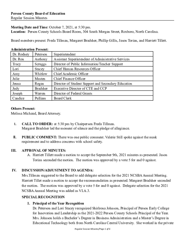 Person County Board of Education Regular Session Minutes Meeting Date and Time: October 7, 2021, at 5:30 pm. Location: Person County Schools Board Room, 304 South Morgan Street, Roxbury, North Carolina.
