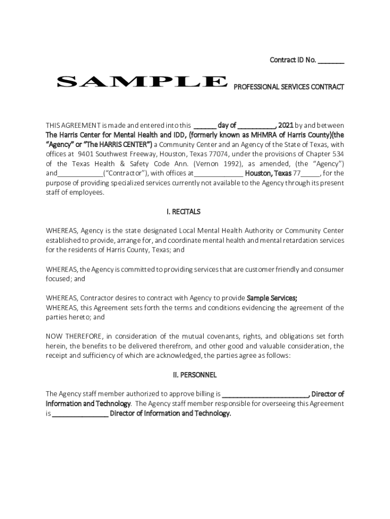 Contract ID No. ___ PROFESSIONAL SERVICES CONTRACTS AGREEMENT is made and entered into this ___ day of ___, 2021 by and between The Harris Center for Mental Health and ADD, (formerly known as MH MRA