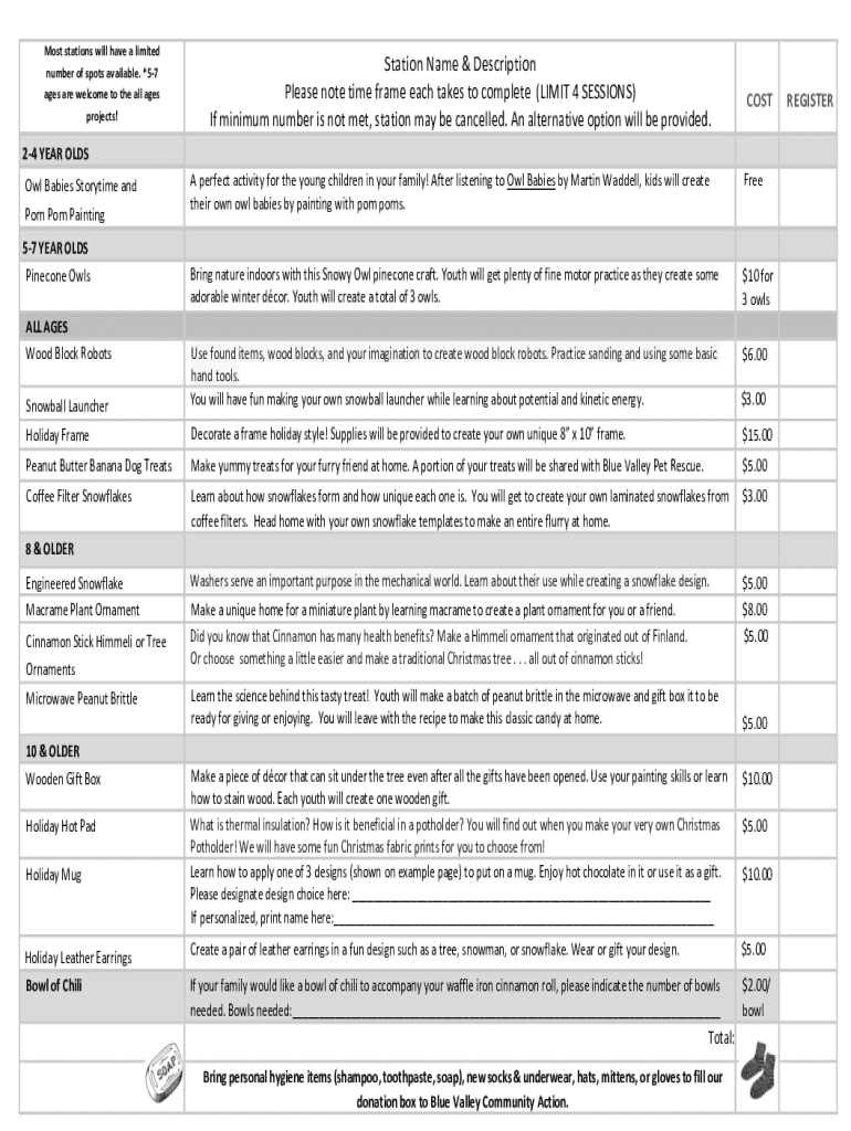 Most stations will have a limited number of spots available. *57 ages are welcome to the all ages projects! Station Name & Description Please note time frame each takes to complete (LIMIT 4 SESSIONS)