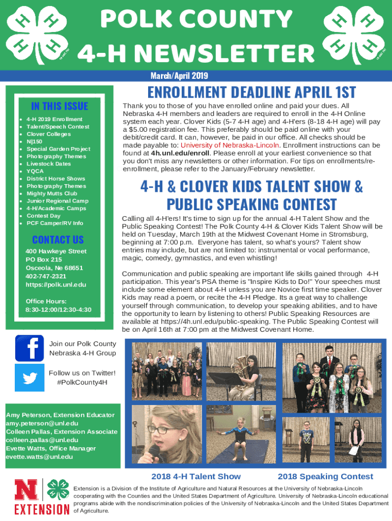 POLK COUNTY 4H NEWSLETTER March/April 2019IN THIS ISSUEENROLLMENT DEADLINE APRIL 1STThank you to those of you have enrolled online and paid your dues. All Nebraska 4H members and leaders are required