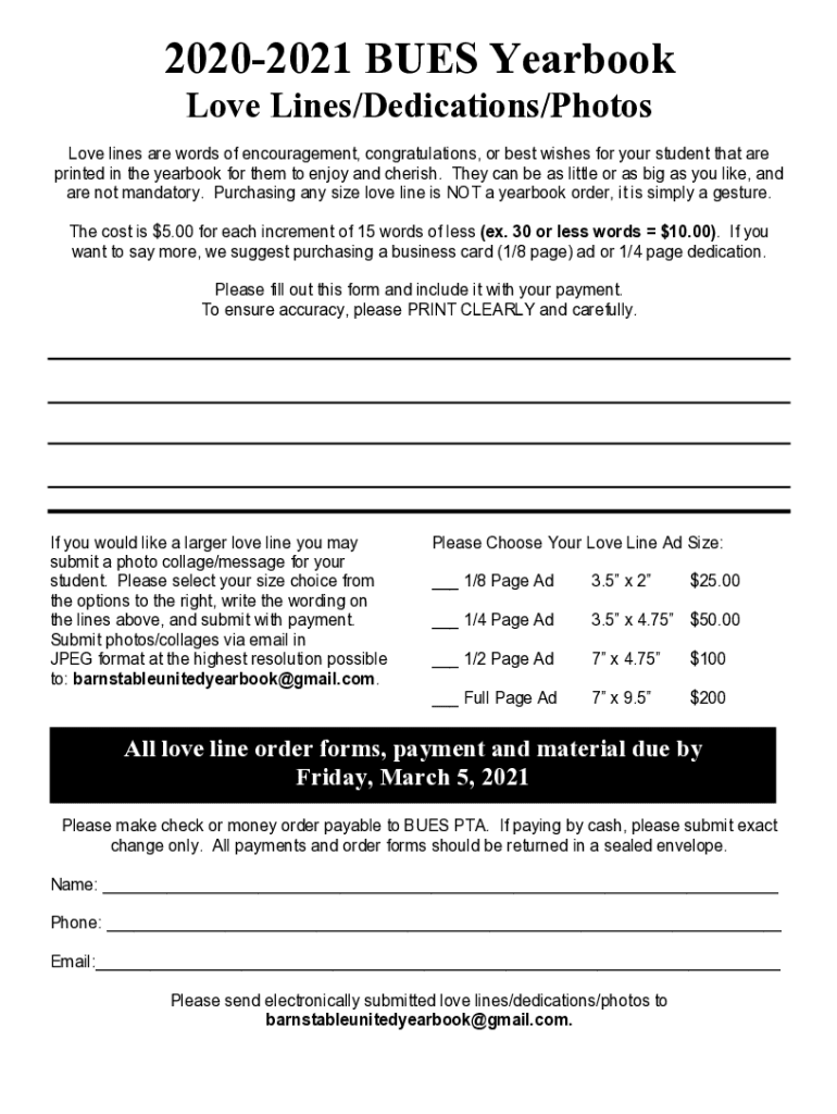 20202021 BUS Yearbook Love Lines/Dedications/Photos Love lines are words of encouragement, congratulations, or best wishes for your student that are printed in the yearbook for them to enjoy and cherish.