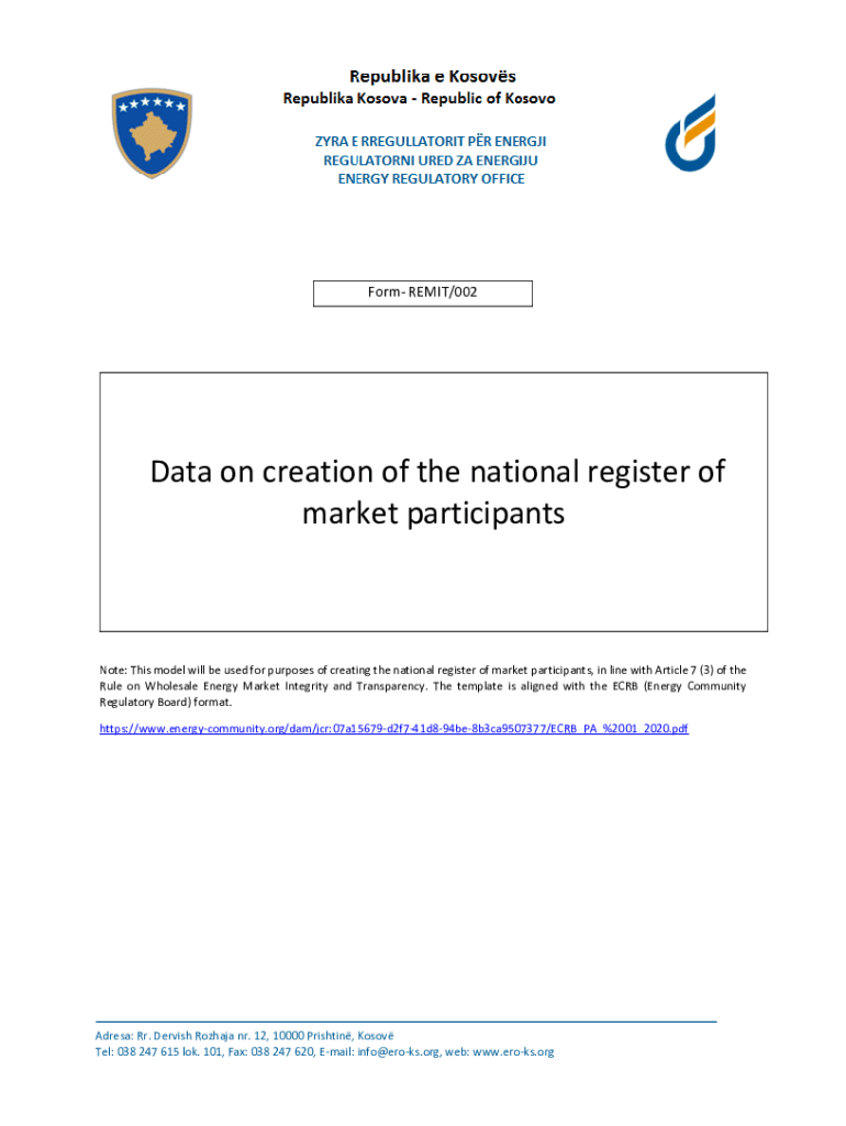 Form REMIT/002Data on creation of the national register of market participantsNote: This model will be used for purposes of creating the national register of market participants, in line with Article