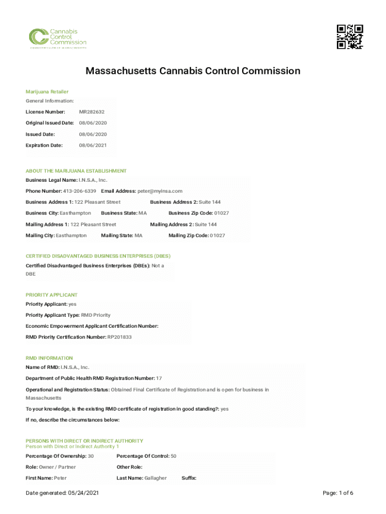 Massachusetts Cannabis Control Commission Marijuana Retailer General Information: License Number:MR282632Original Issued Date: 08/06/2020 Issued Date:08/06/2020Expiration Date:08/06/2021ABOUT THE