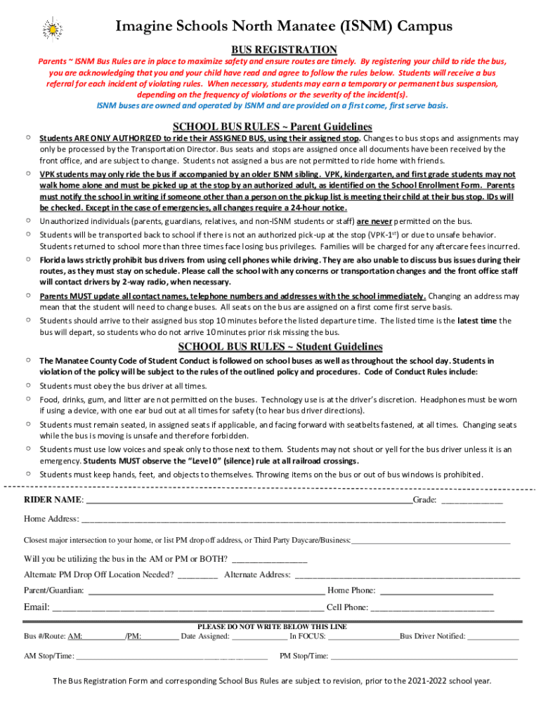 Imagine Schools North Manatee (IINM) Campus BUS REGISTRATION Parents IINM Bus Rules are in place to maximize safety and ensure routes are timely. By registering your child to ride the bus, you are