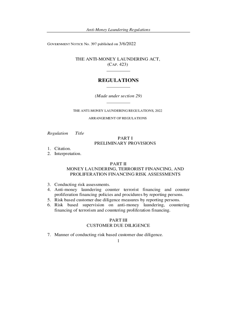 Antimony Laundering Regulations GN. No. 397 (Contd) GOVERNMENT NOTICE No. 397 published on 3/6/2022THE ANTIMONY LAUNDERING ACT, (CAP. 423) ___REGULATIONS ___ (Made under section 29) ___ THE ANTIMONY